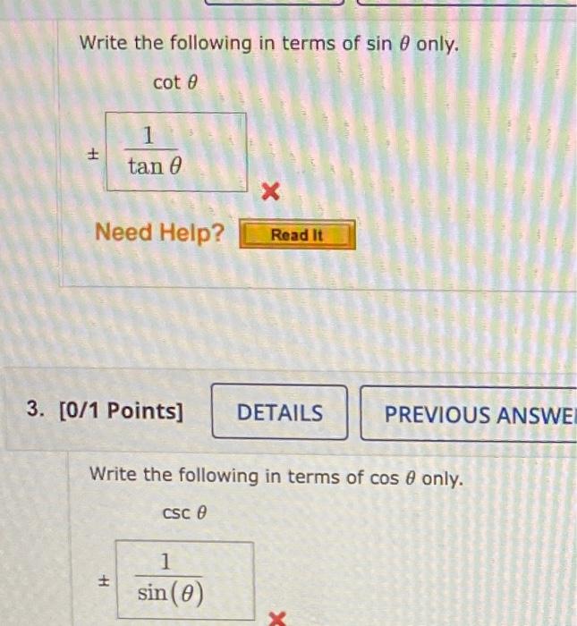 ![Solved Write the following in terms of sinθ only. cotθ 0/1